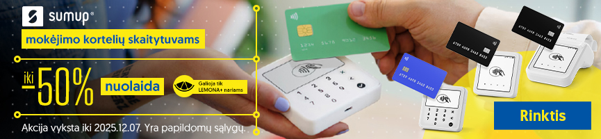 Naudodami „SumUp“ mokėjimo terminalą jūsų klientai gali atsiskaityti tiek kortele, tiek mobiliuoju telefonu. Operacijos mokestis – tik 1,69%, nepriklausomai nuo kortelės tipo.